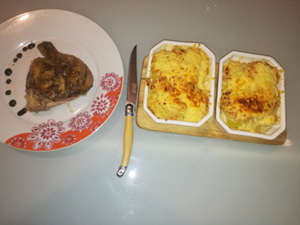 Poulet en crapaudine au siave (sauce au soja) & sabots gratin de patate
