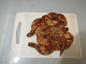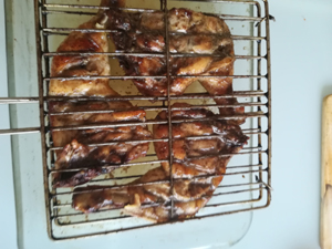 Poulet en crapaudine au siave (sauce au soja) & sabots gratin de patate